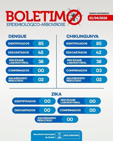 A Secretaria Municipal de Saúde confirmou o registro de três casos de chikungunya em Nova Andradina, conforme boletim epidemiológico divulgado nesta quarta-feira (1º). O cenário acende um alerta diante do aumento de notificações e casos confirmados de dengue e chikungunya nas últimas semanas.
