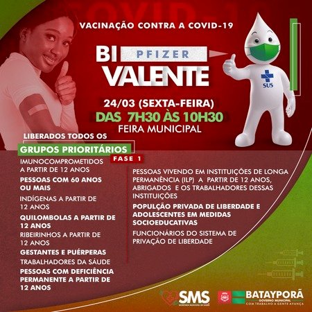 A vacinação bivalente contra a Covid-19 foi ampliada pelo Ministério da Saúde e, em Batayporã, a imunização de todos os grupos prioritários inicia nesta sexta-feira (24), na Feira Municipal, das 7h30 às 10h30. Para receber a vacina bivalente, é necessário estar com o esquema primário em dia.