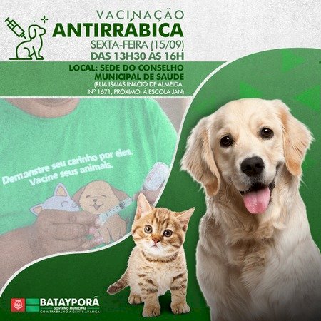 A Secretaria Municipal de Saúde de Batayporã continua a campanha de vacinação contra a raiva animal. Na próxima sexta-feira (15), as equipes estarão concentradas na sede do Conselho Municipal de Saúde, localizado na Rua Isaías Inácio de Almeida, 1671, das 13h30 às 16h, para vacinar cães e gatos machos e fêmeas a partir dos três meses de idade.